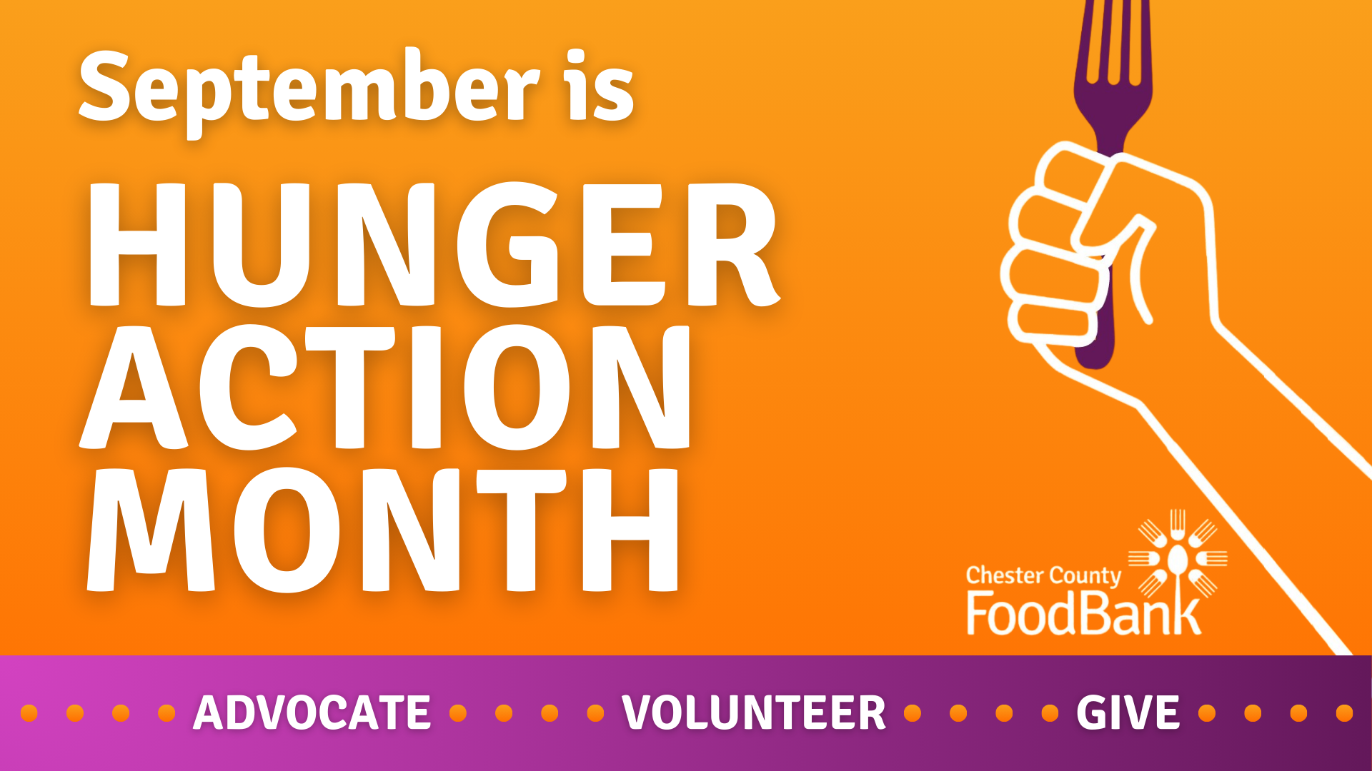 Chester County Food Bank is proud to be an active participant in Hunger Action Month. Join us for a community effort to collect 12,000 pounds of donated food in September for Hunger Action Month. We are hosting an on-site Food Drive on Saturday, September 20, from 9:00am to 12:00pm at our location in Exton (650 Pennsylvania Dr, in the Eagleview Corporate Center). Not able to join us for the food collection? You can drop of donations Monday – Friday 8:00 am – 5:00pm at our location in Exton.