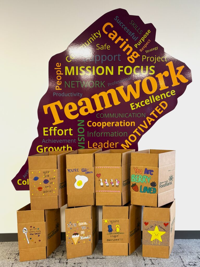Our Color Some Kindness program offers volunteers the opportunity to decorate grocery boxes with cheerful, heartfelt messages to help bring smiles to seniors facing food insecurity in Chester County. Once designed, these boxes are brought back to CCFB where they are filled with much-needed food items and then delivered to seniors across the County. These boxes are so beloved by our senior neighbors, that some have even used their boxes as decorations.