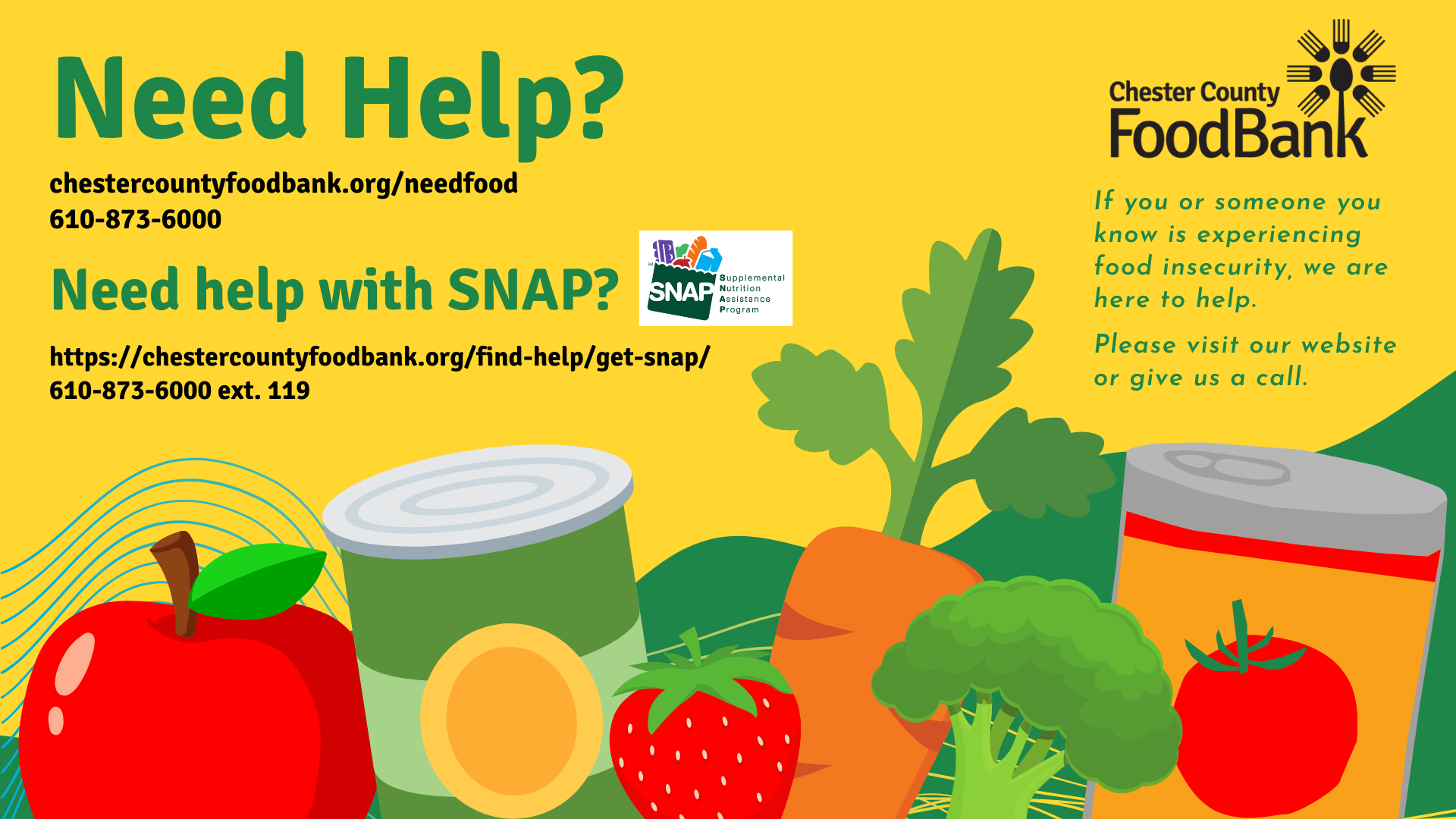 If you are in need of assistance during this time, please call 211, or visit us at our website at https://chestercountyfoodbank.org/find-help/food-finder/