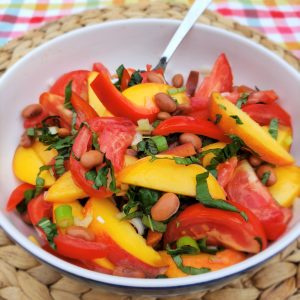 This peach and tomato salad is a delicious way to taste and celebrate Summer! The combination of skin-on peaches and tomatoes of various colors, sizes, and shapes creates a sweet-savory salad.