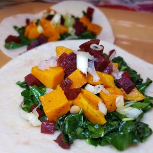 There are limitless possibilities for taco/burrito assembly outside of the traditional meat and cheese. We're featuring butternut squash, beets, and beet greens but this recipe is so easy for you to adapt to whatever is in season!